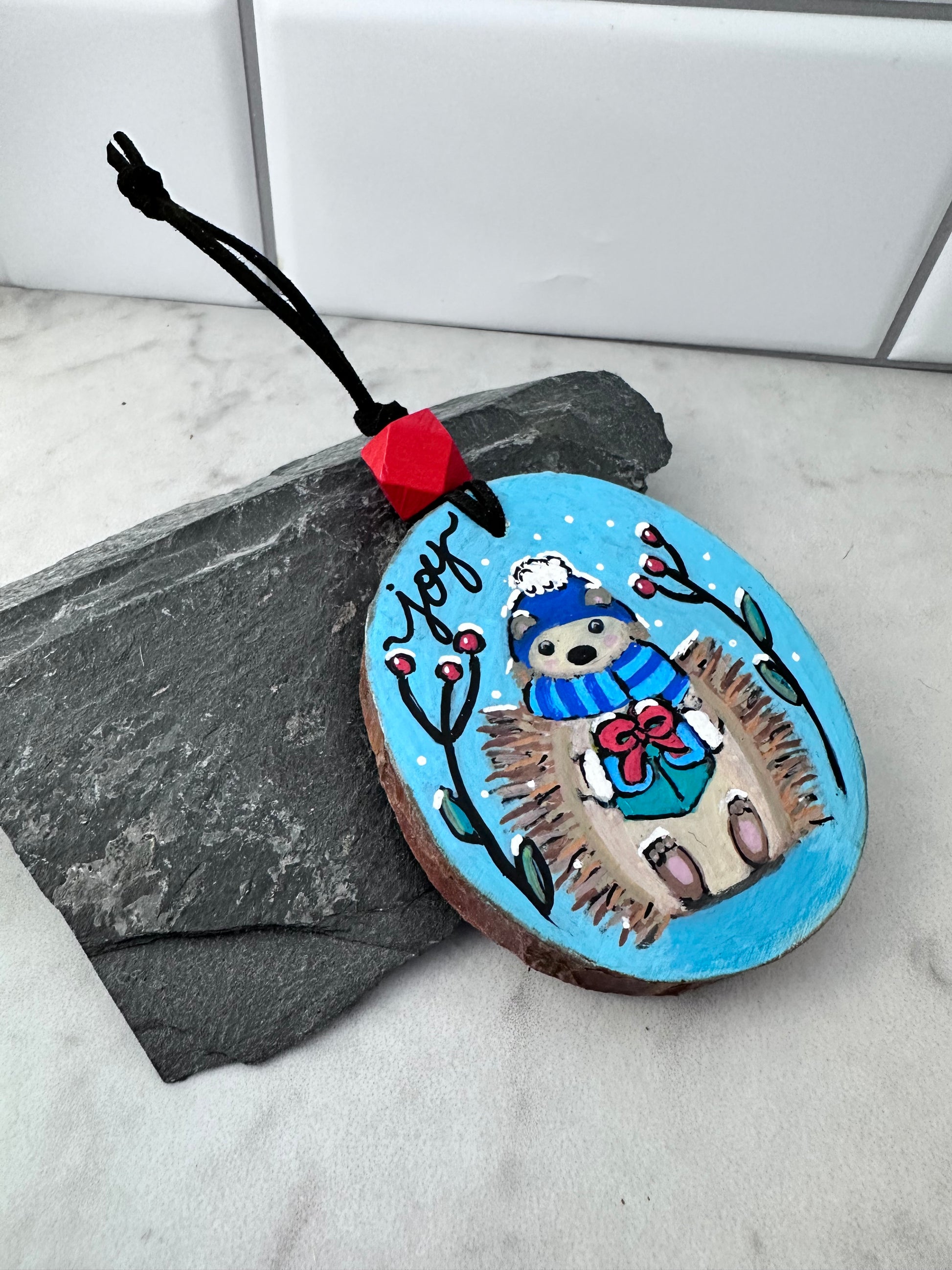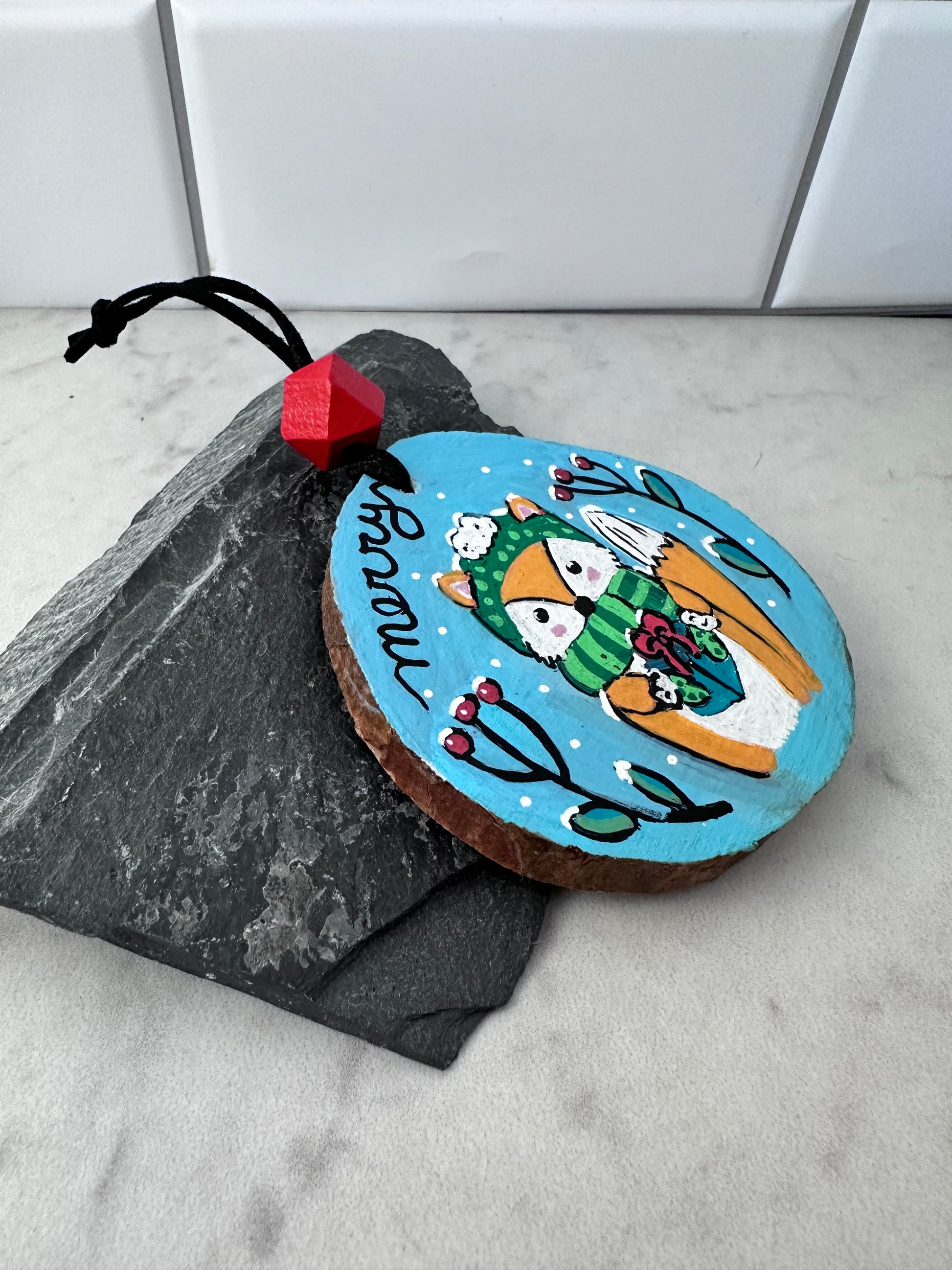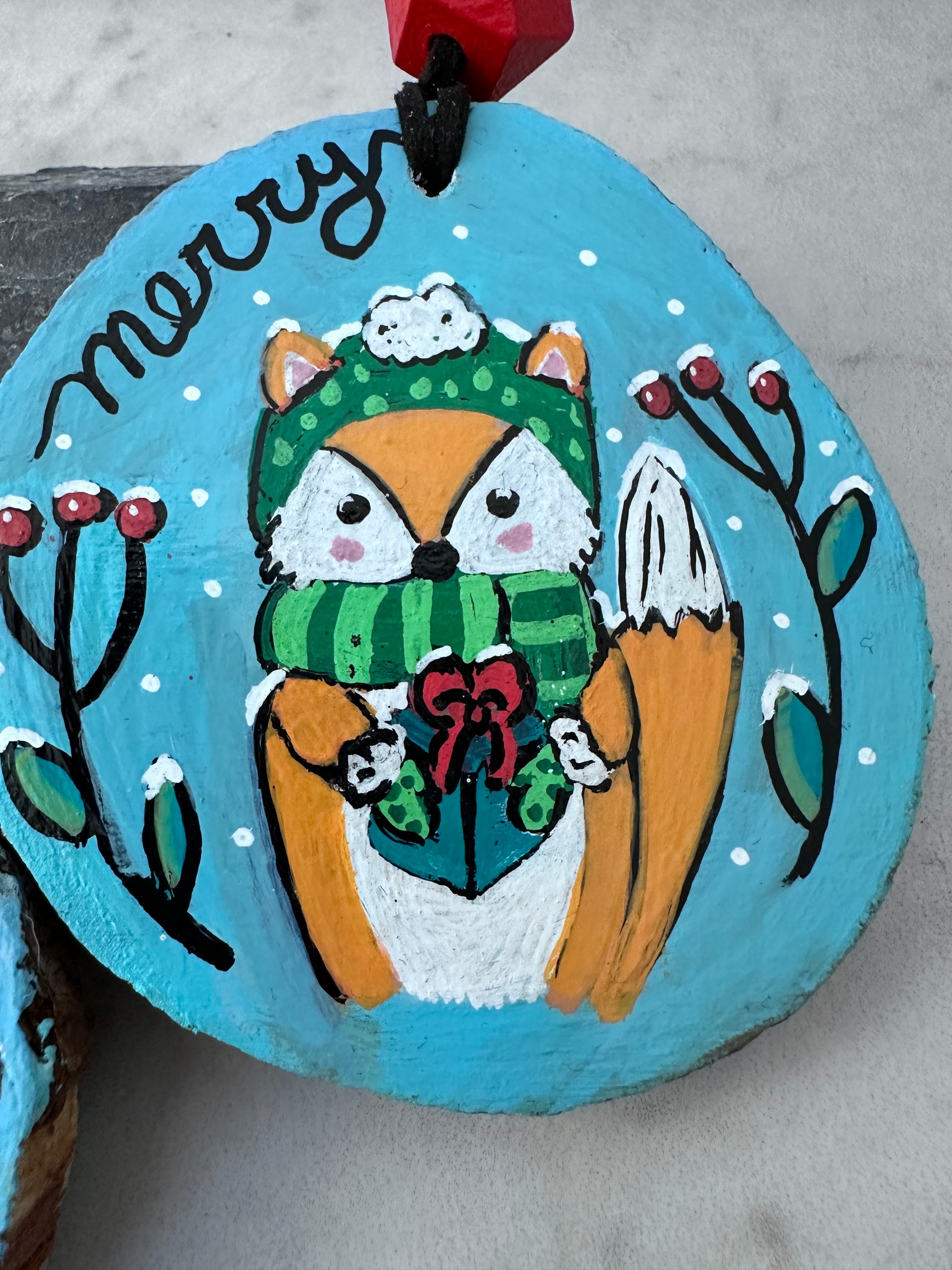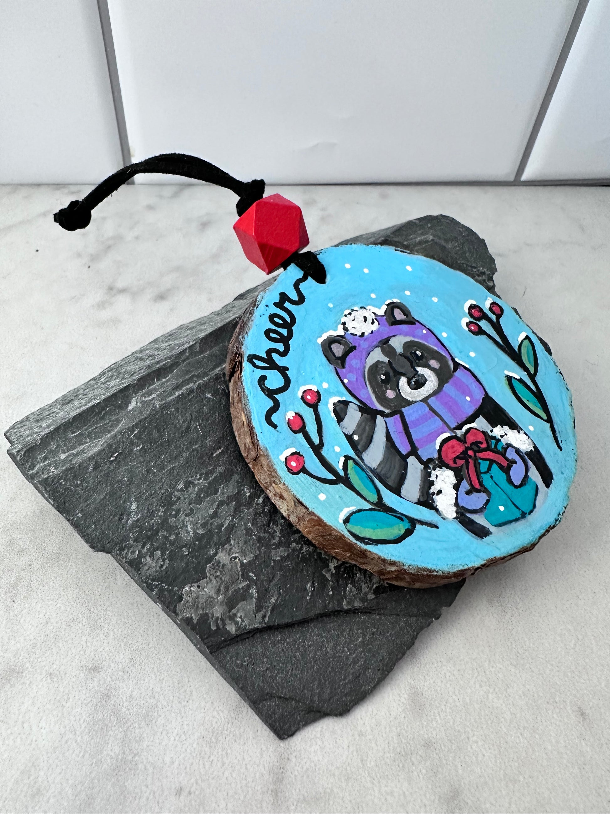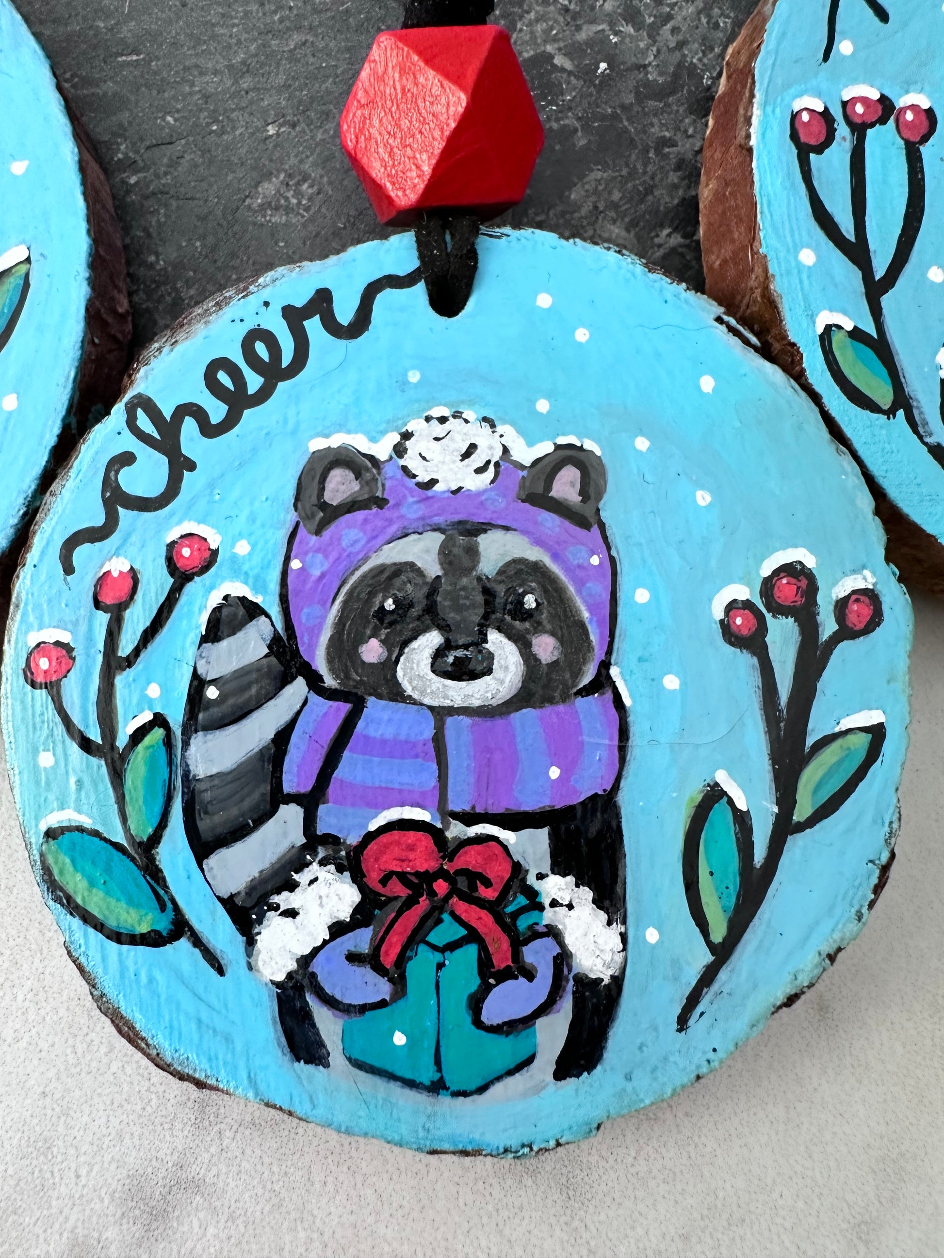 These are hand-painted and lettered pinewood slice ornaments featuring a trio of cute woodland animals–a “merry” fox, a “cheer” raccoon, and a “joy” hedgehog, each dressed for the cold weather, holding a green present with a red bow, flanked by snowflakes, red berries and green foliage. Painting these was fun and definitely a labor of love! Each ornament is strung on strung on black vegan suede lacing with a faceted wooden bead painted red. I used acrylic paint over gesso, and sealed them with satin varnish both on the front and back, so they can be enjoyed for many holidays to come.
